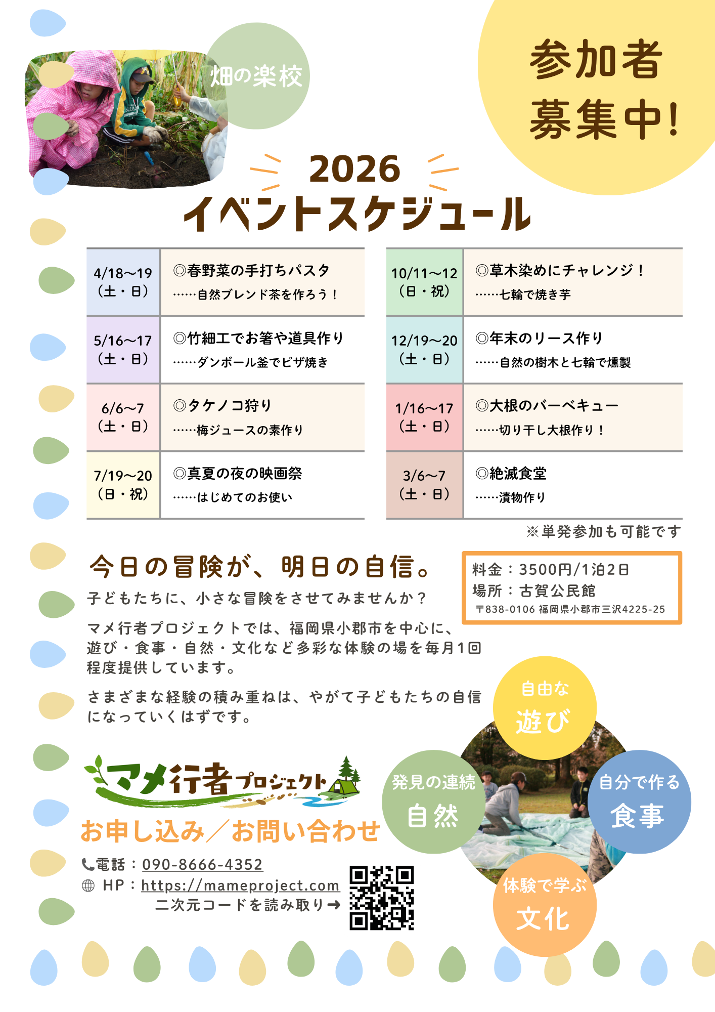 マメ行者プロジェクトでは、福岡県小郡市を中心に、遊び・食事・自然・文化など多彩な体験の場を毎月1回程度提供しています。