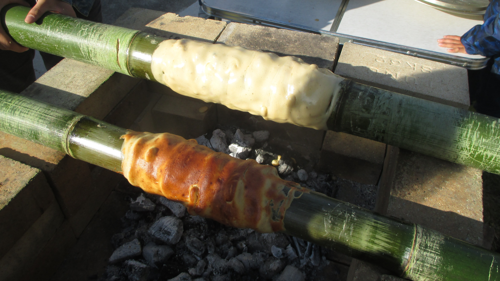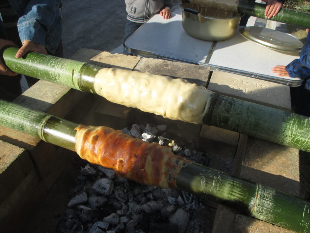 ピザを焼き、野草で手打ちパスタを作り、竹でバームクーヘンを焼く。